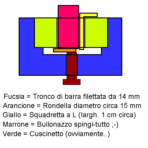 Ho preso una barra filettata da 14 mm (non perchè mi serviva qualcosa di filettato, ma solo perchè non avevo altro di quello spessore), ne ho tagliato un pezzetto di alcuni centimetri di lunghezza (la parte fucsia nel disegno), dopodichè su uno dei due estremi (quello inferiore) ho fissato a mezzo vite parker (con testa svasata, per non creare inutile spessore aggiuntivo verso il basso) una rondellona bella spessa, avente un diametro esterno di circa 15-16 mm, ed avendo cura di posizionarla sufficientemente disassata rispetto all'asse longitudinale della barretta filettata (parte arancione del disegno).